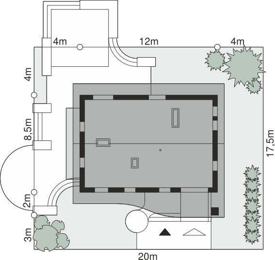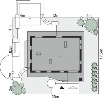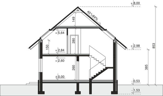 Ściany zewnętrzne: pustak 25 cm, styropian 15 cm. Ściany nośne: pustak 25 cm. Strop: monolityczny żelbetowy. Dach: kąt nachylenia 40°, pokrycie - dachówka ceramiczna lub betonowa.