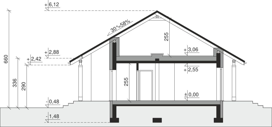 Ściany zewnętrzne: pustak 25 cm, styropian 20 cm. Ściany nośne: pustak 25 cm. Strop: monolityczny żelbetowy. Dach: kąt nachylenia 30°, pokrycie - dachówka ceramiczna lub betonowa. Instalacja solarna.