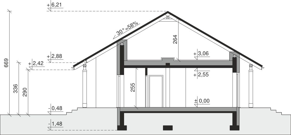 Ściany zewnętrzne: pustak 25 cm, styropian 20 cm. Ściany nośne: pustak 25 cm. Strop: monolityczny żelbetowy. Dach: kąt nachylenia 30°, pokrycie - dachówka ceramiczna lub betonowa. Instalacja solarna.
