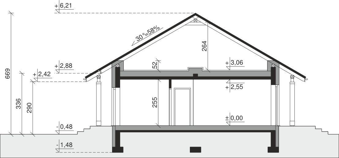 Ściany zewnętrzne: pustak 25 cm, styropian 20 cm. Ściany nośne: pustak 25 cm. Strop: monolityczny żelbetowy. Dach: kąt nachylenia 30°, pokrycie - dachówka ceramiczna lub betonowa. Instalacja solarna.