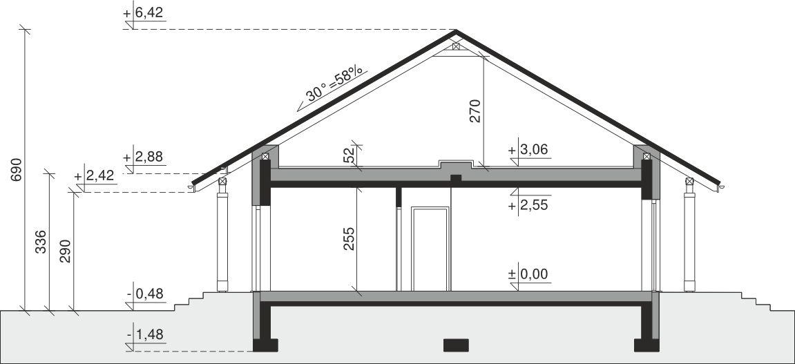 Ściany zewnętrzne: pustak 25 cm, styropian 20 cm. Ściany nośne: pustak 25 cm. Strop: monolityczny żelbetowy. Dach: kąt nachylenia 30°, pokrycie - dachówka ceramiczna lub betonowa. Instalacja solarna.