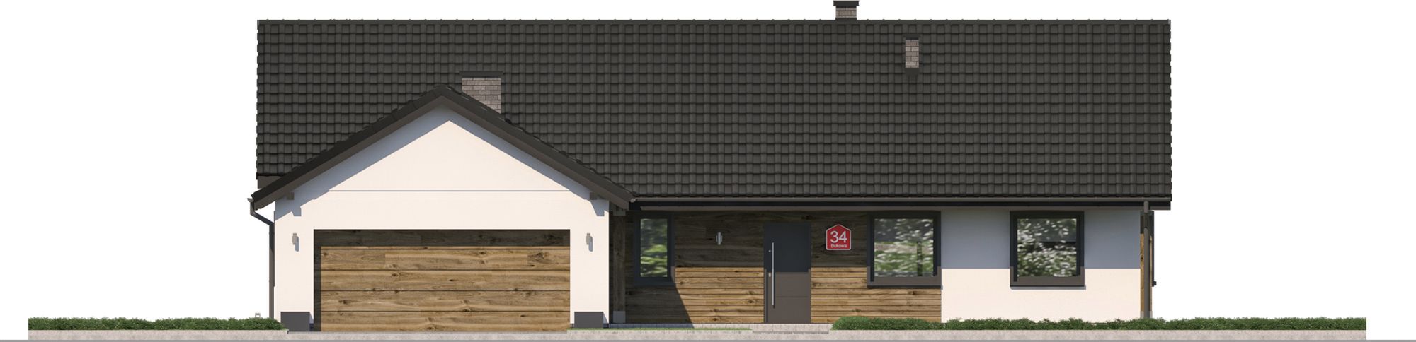Projekt Dom przy Bukowej 34 charakteryzuje się prostą, parterową bryłą przykrytą klasycznym dachem dwuspadowym, co jest sprawdzonym i ekonomicznym w realizacji rozwiązaniem. Tradycyjny styl budynku podkreślają dach z okapem oraz harmonijna kompozycja elewacji. Garaż wysunięty do przodu tworzy praktyczne zadaszenie nad wejściem i nadaje frontowej części domu dynamicznego charakteru.