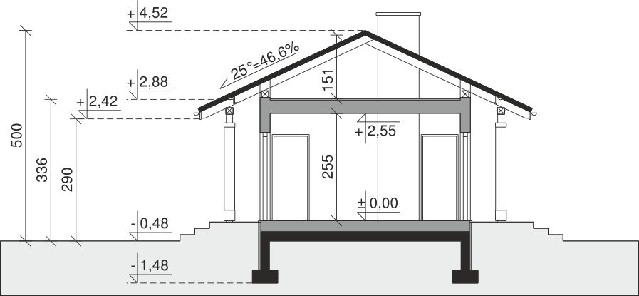 Ściany zewnętrzne: szkielet drewniany 24cm. Ściany nośne: brak. Strop: drewniany. Dach: kąt nachylenia 25°, pokrycie - dachówka ceramiczna lub betonowa. Instalacja solarna.