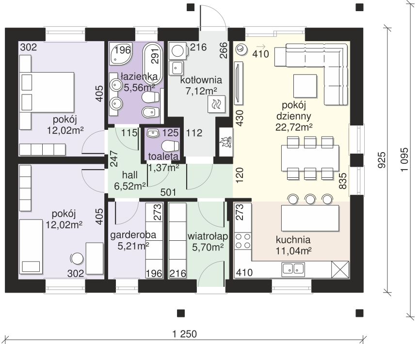 Ściany zewnętrzne: pustak 25 cm, styropian 20 cm. Ściany nośne: pustak 25 cm. Strop: monolityczny żelbetowy. Dach: kąt nachylenia 30°, pokrycie - dachówka ceramiczna lub betonowa. Instalacja solarna.