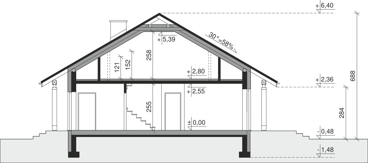 Ściany zewnętrzne: pustak 25 cm, styropian 20 cm. Ściany nośne: pustak 25 cm. Strop: monolityczny żelbetowy. Dach: kąt nachylenia 30°, pokrycie - dachówka ceramiczna lub betonowa. Instalacja solarna.