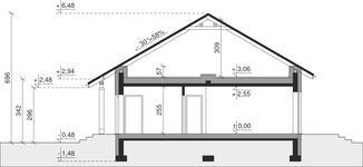 Ściany zewnętrzne: pustak 25 cm, styropian 20 cm. Ściany nośne: pustak 25 cm. Strop: monolityczny żelbetowy. Dach: kąt nachylenia 30°, pokrycie - dachówka ceramiczna lub betonowa. Instalacja solarna. Ogrzewanie podłogowe.
