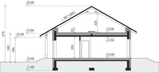 Ściany zewnętrzne: pustak 25 cm, styropian 20 cm. Ściany nośne: pustak 25 cm. Strop: monolityczny żelbetowy. Dach: kąt nachylenia 30°, pokrycie - dachówka ceramiczna lub betonowa. Instalacja solarna.