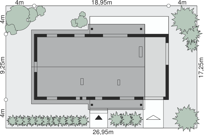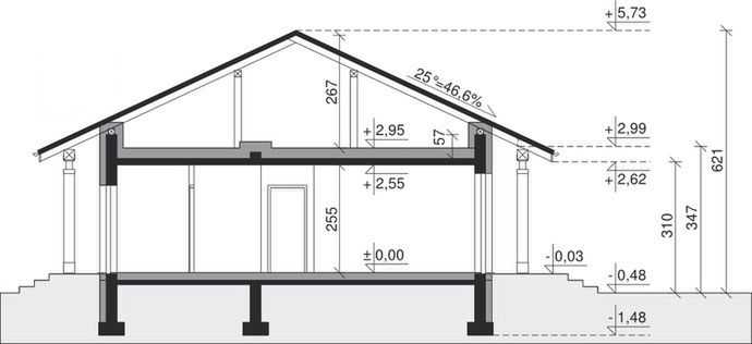 Ściany zewnętrzne: pustak 25 cm, styropian 15 cm. Ściany nośne: pustak 25 cm. Strop: monolityczny żelbetowy. Dach: kąt nachylenia 25°, pokrycie - dachówka ceramiczna lub betonowa.