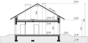 Ściany zewnętrzne: pustak 25 cm, styropian 20 cm. Ściany nośne: pustak 25 cm. Strop: monolityczny żelbetowy. Dach: kąt nachylenia 30°, pokrycie - dachówka ceramiczna lub betonowa. Instalacja solarna.