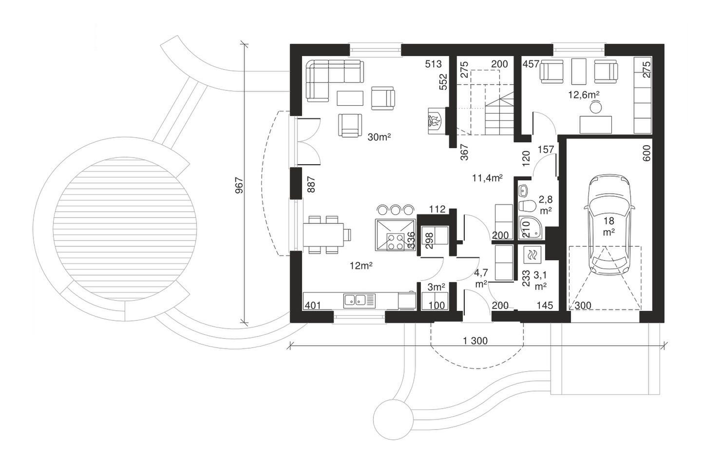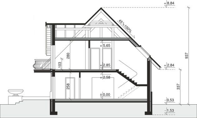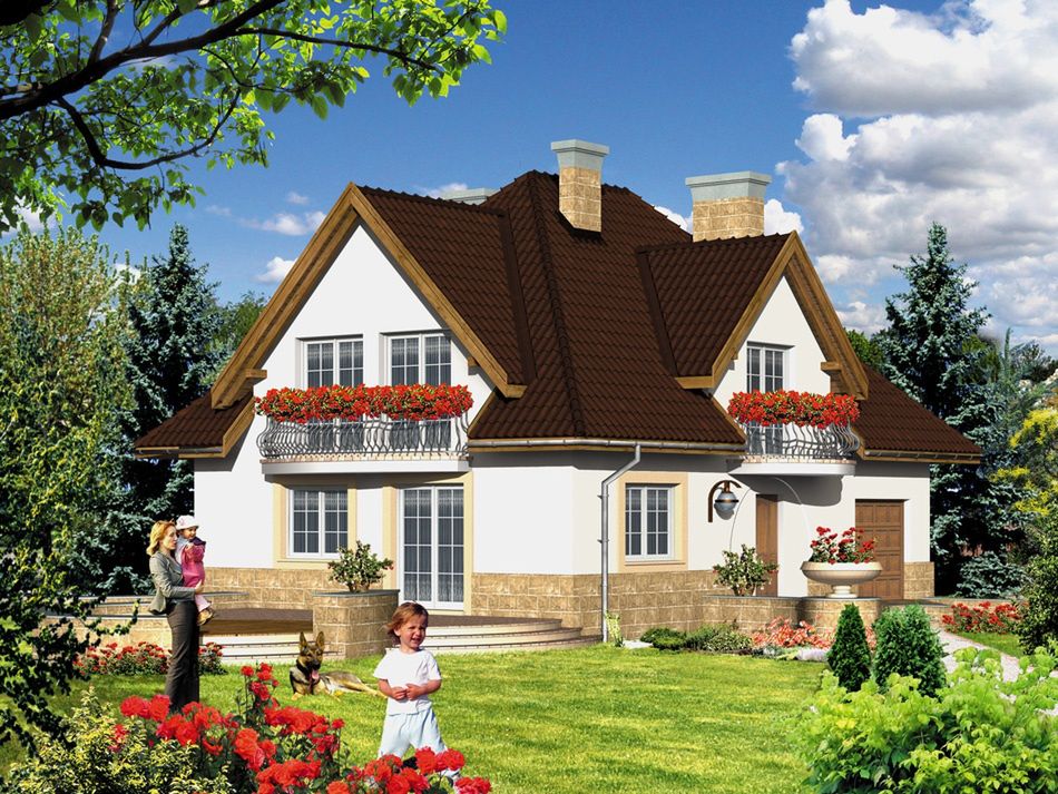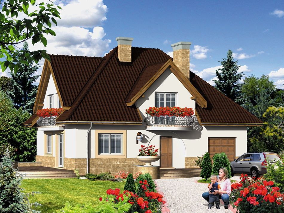 Graficzne opracowanie rzutów poglądowych widocznych na karcie projektu zostało wykonane przez Extradom.pl. Prezentowane przez Extradom.pl wizualizacje wykonane zostały przez autora projektu i należy poczytywać je jedynie za przykład i propozycję wykończenia, wizję architektoniczną autora projektu. Ostateczne wykończenie budynku może nastąpić na wiele sposobów. Szczegółowe rozwiązania zastosowane w oferowanej dokumentacji - w tym również ilość, lokalizacje i wygląd okien, drzwi, kominów - mogą w niewielkim stopniu różnić się od prezentowanej wizualizacji budynku.