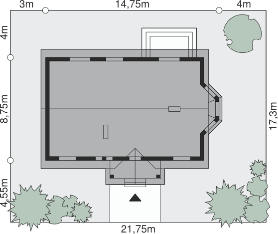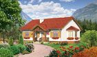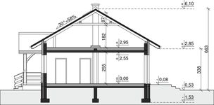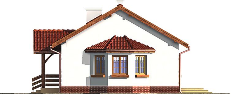Ściany zewnętrzne: pustak 25 cm, styropian 15 cm. Ściany nośne: pustak 25 cm. Strop: monolityczny żelbetowy. Dach: kąt nachylenia 30°, pokrycie - dachówka ceramiczna lub betonowa.