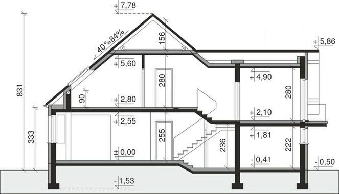 Ściany zewnętrzne: pustak 25 cm, styropian 15 cm. Ściany nośne: pustak 25 cm. Strop: monolityczny żelbetowy. Dach: kąt nachylenia 40°, pokrycie - dachówka ceramiczna lub betonowa.