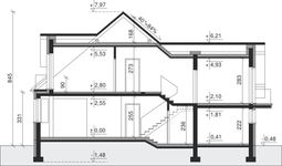 Ściany zewnętrzne: pustak 25 cm, styropian 20 cm. Ściany nośne: pustak 25 cm. Strop: monolityczny żelbetowy. Dach: kąt nachylenia 40°, pokrycie - dachówka ceramiczna lub betonowa.