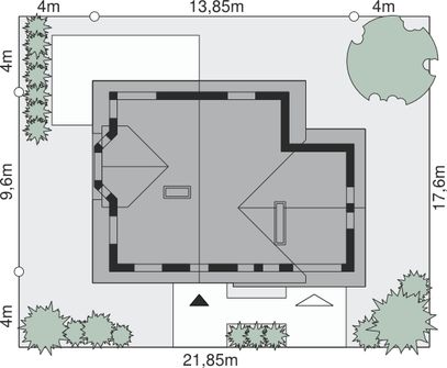 Najmniejsza możliwa długość działki niezbędna do wybudowania wybranego domu. Składa się z długości elewacji domu powiększonej z obu stron o 3 m dla ściany bez otworów drzwiowych/okiennych lub 4 m, dla ściany z otworami.
