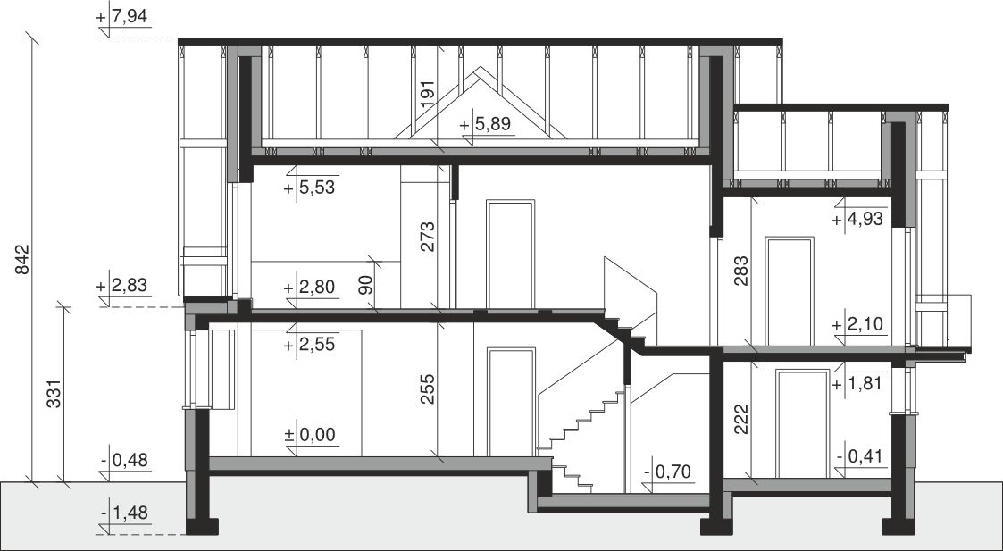 Ściany zewnętrzne: pustak 25 cm, styropian 20 cm. Ściany nośne: pustak 25 cm. Strop: monolityczny żelbetowy. Dach: kąt nachylenia 40°, pokrycie - dachówka ceramiczna lub betonowa. Instalacja solarna.