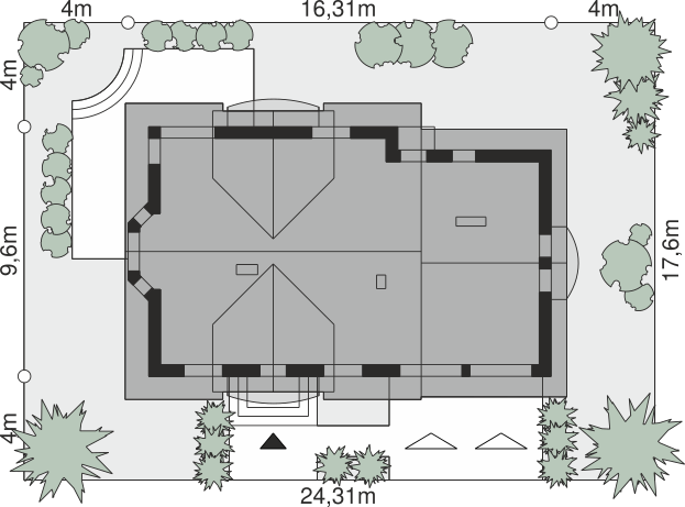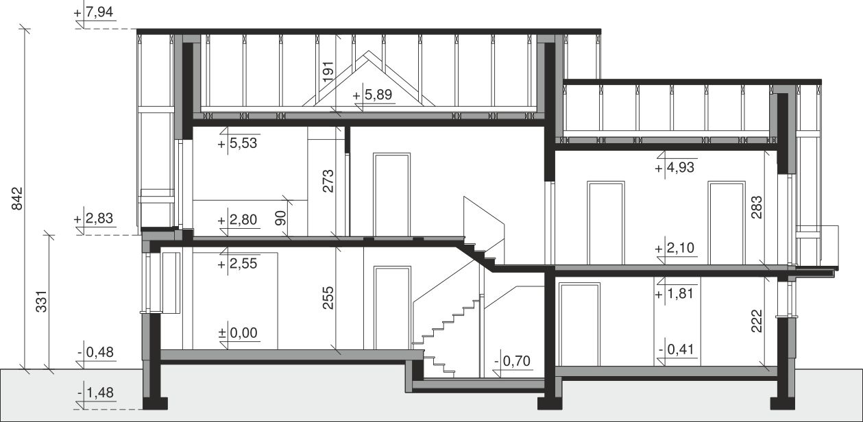 Ściany zewnętrzne: pustak 25 cm, styropian 20 cm. Ściany nośne: pustak 25 cm. Strop: monolityczny żelbetowy. Dach: kąt nachylenia 40°, pokrycie - dachówka ceramiczna lub betonowa. Instalacja solarna.
