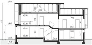 Ściany zewnętrzne: pustak 25 cm, styropian 20 cm. Ściany nośne: pustak 25 cm. Strop: monolityczny żelbetowy. Dach: kąt nachylenia 40°, pokrycie - dachówka ceramiczna lub betonowa. Instalacja solarna.