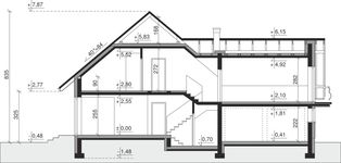 Ściany zewnętrzne: pustak 25 cm, styropian 20 cm. Ściany nośne: pustak 25 cm. Strop: monolityczny żelbetowy. Dach: kąt nachylenia 40°, pokrycie - dachówka ceramiczna lub betonowa. Instalacja solarna.
