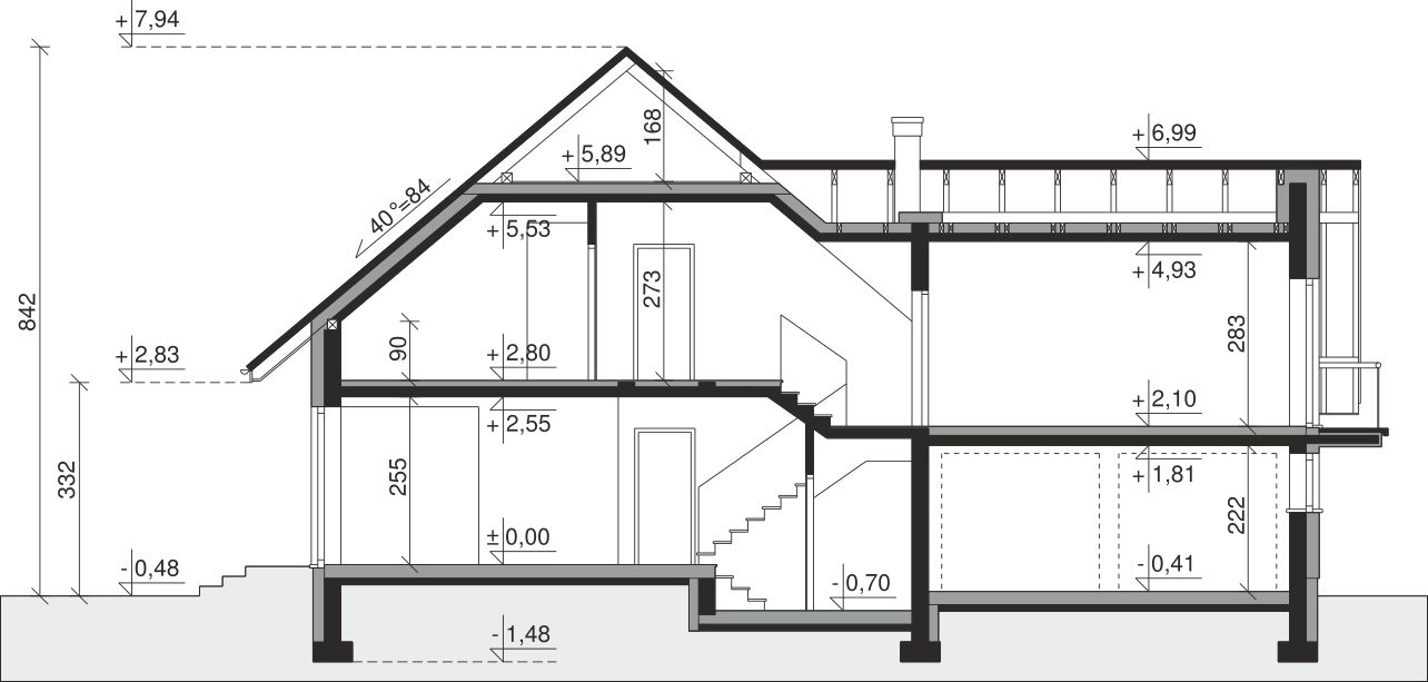 Ściany zewnętrzne: pustak 25 cm, styropian 20 cm. Ściany nośne: pustak 25 cm. Strop: monolityczny żelbetowy. Dach: kąt nachylenia 40°, pokrycie - dachówka ceramiczna lub betonowa.