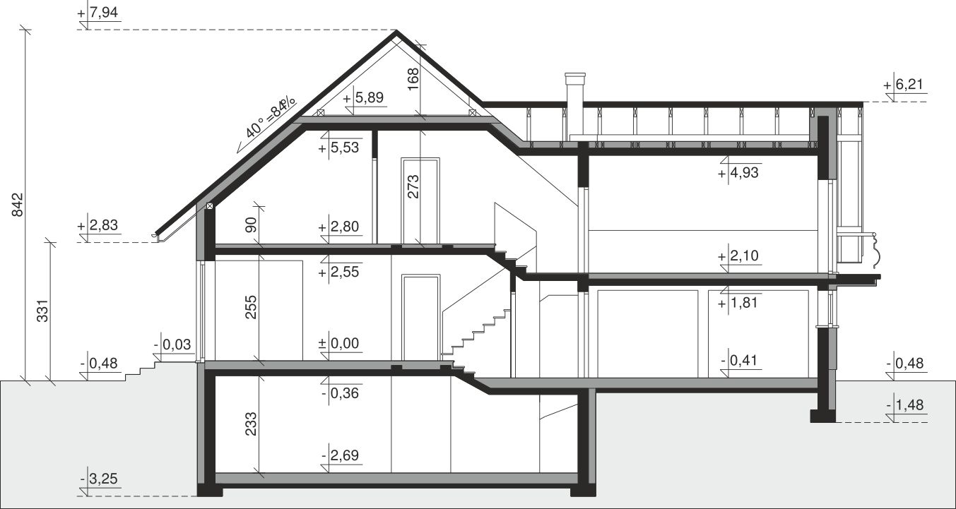 Ściany zewnętrzne: pustak 25 cm, styropian 20 cm. Ściany nośne: pustak 25 cm. Strop: monolityczny żelbetowy. Dach: kąt nachylenia 40°, pokrycie - dachówka ceramiczna lub betonowa. Instalacja solarna.