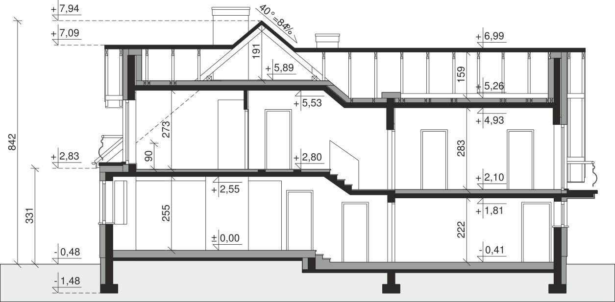 Ściany zewnętrzne: pustak 25 cm, styropian 20 cm. Ściany nośne: pustak 25 cm. Strop: monolityczny żelbetowy. Dach: kąt nachylenia 40°, pokrycie - dachówka ceramiczna lub betonowa.