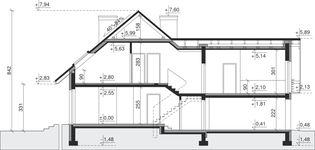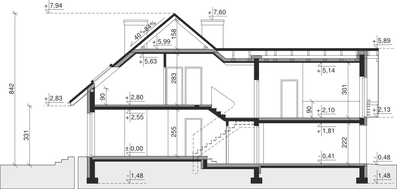 Ściany zewnętrzne: pustak 25 cm, styropian 20 cm. Ściany nośne: pustak 25 cm. Strop: monolityczny żelbetowy. Dach: kąt nachylenia 40°, pokrycie - dachówka ceramiczna lub betonowa.