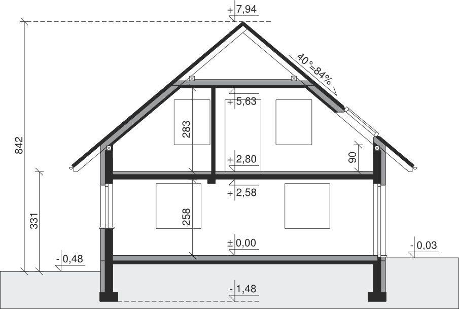 Ściany zewnętrzne: pustak 25 cm, styropian 20 cm. Ściany nośne: pustak 25 cm. Strop: monolityczny żelbetowy. Dach: kąt nachylenia 40°, pokrycie - dachówka ceramiczna lub betonowa. Instalacja solarna.