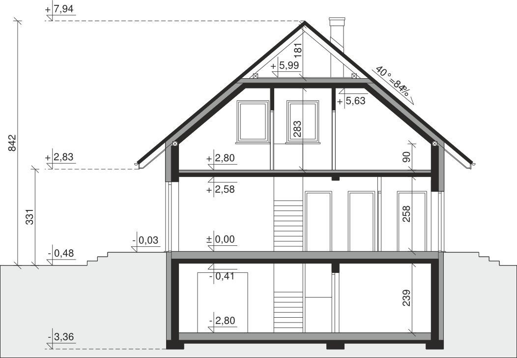 Ściany zewnętrzne: pustak 25 cm, styropian 20 cm. Ściany nośne: pustak 25 cm. Strop: monolityczny żelbetowy. Dach: kąt nachylenia 40°, pokrycie - dachówka ceramiczna lub betonowa. Instalacja solarna.