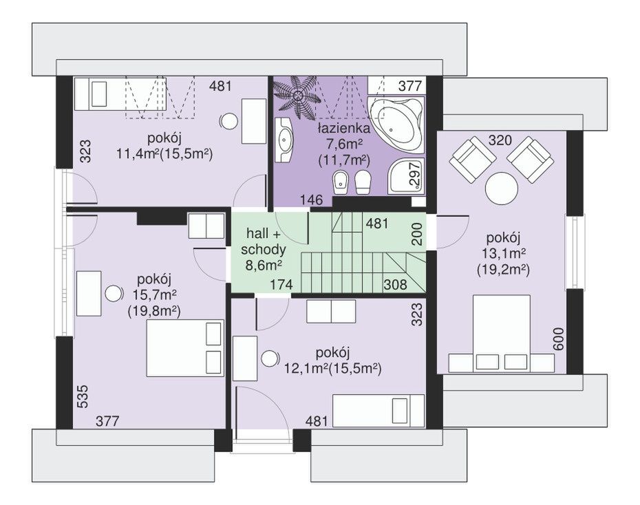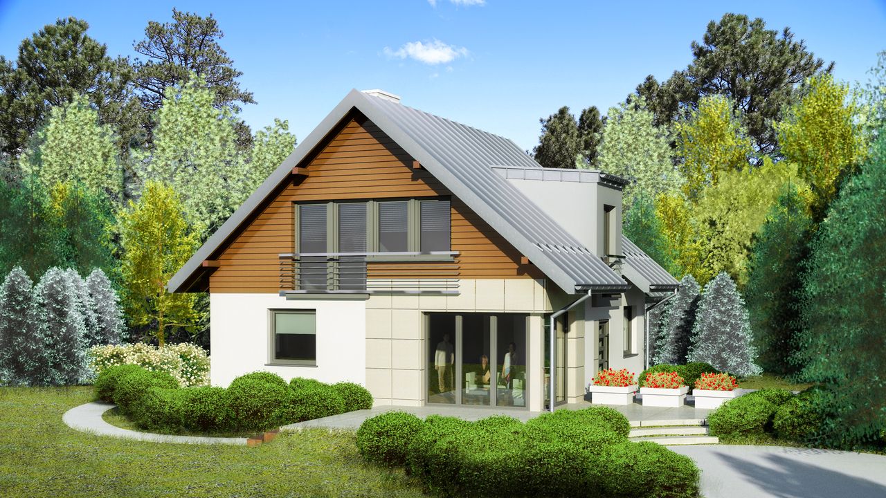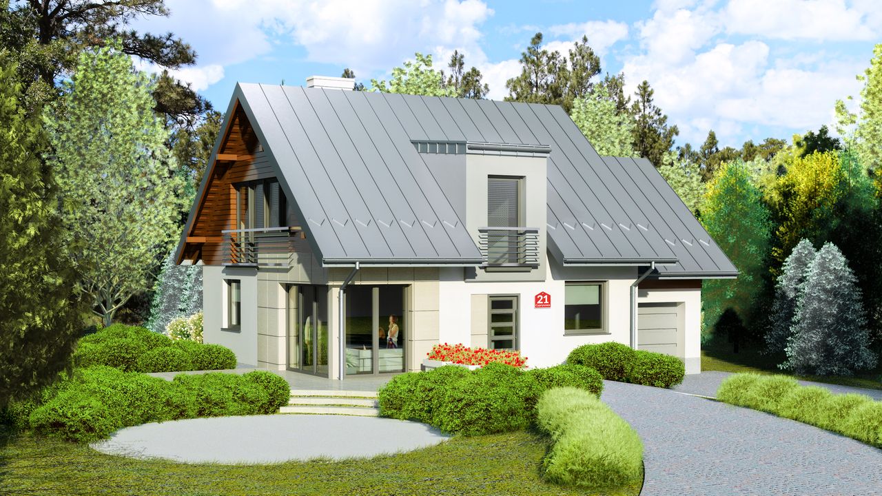 Graficzne opracowanie rzutów poglądowych widocznych na karcie projektu zostało wykonane przez Extradom.pl. Prezentowane przez Extradom.pl wizualizacje wykonane zostały przez autora projektu i należy poczytywać je jedynie za przykład i propozycję wykończenia, wizję architektoniczną autora projektu. Ostateczne wykończenie budynku może nastąpić na wiele sposobów. Szczegółowe rozwiązania zastosowane w oferowanej dokumentacji - w tym również ilość, lokalizacje i wygląd okien, drzwi, kominów - mogą w niewielkim stopniu różnić się od prezentowanej wizualizacji budynku.