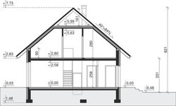 Ściany zewnętrzne: pustak 25 cm, styropian 20 cm. Ściany nośne: pustak 25 cm. Strop: monolityczny żelbetowy. Dach: kąt nachylenia 40°, pokrycie - dachówka ceramiczna lub betonowa. Instalacja solarna.