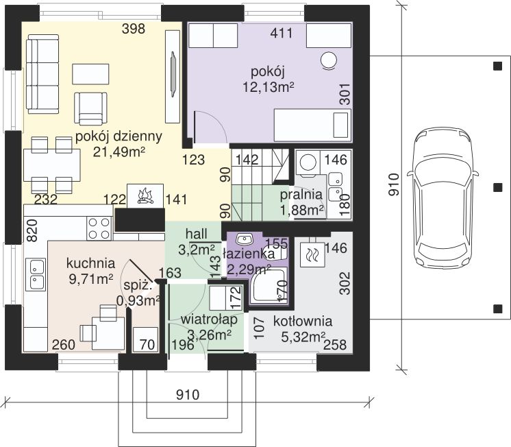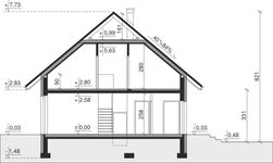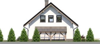 Graficzne opracowanie rzutów poglądowych widocznych na karcie projektu zostało wykonane przez Extradom.pl. Prezentowane przez Extradom.pl wizualizacje wykonane zostały przez autora projektu i należy poczytywać je jedynie za przykład i propozycję wykończenia, wizję architektoniczną autora projektu. Ostateczne wykończenie budynku może nastąpić na wiele sposobów. Szczegółowe rozwiązania zastosowane w oferowanej dokumentacji - w tym również ilość, lokalizacje i wygląd okien, drzwi, kominów - mogą w niewielkim stopniu różnić się od prezentowanej wizualizacji budynku.