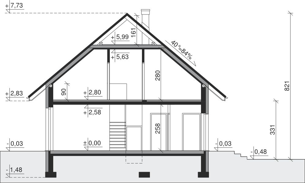 Ściany zewnętrzne: pustak 25 cm, styropian 20 cm. Ściany nośne: pustak 25 cm. Strop: monolityczny żelbetowy. Dach: kąt nachylenia 40°, pokrycie - dachówka ceramiczna lub betonowa. Instalacja solarna.