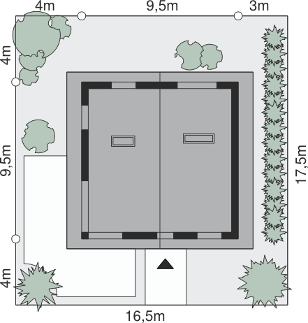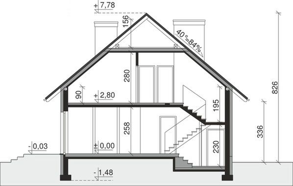 Ściany zewnętrzne: pustak 25 cm, styropian 15 cm. Ściany nośne: pustak 25 cm. Strop: monolityczny żelbetowy. Dach: kąt nachylenia 40°, pokrycie - blacha.