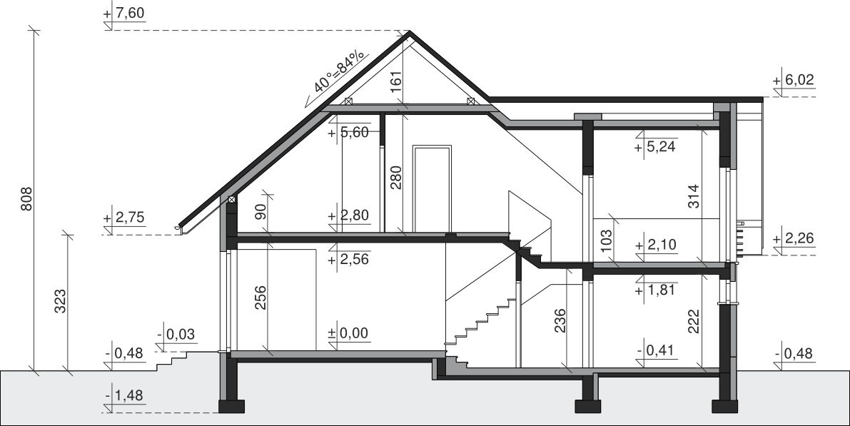 Ściany zewnętrzne: pustak 25 cm, styropian 15 cm. Ściany nośne: pustak 25 cm. Strop: monolityczny żelbetowy. Dach: kąt nachylenia 40°, pokrycie - dachówka ceramiczna lub betonowa.