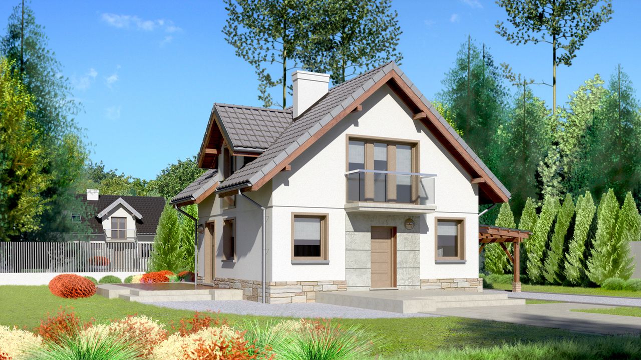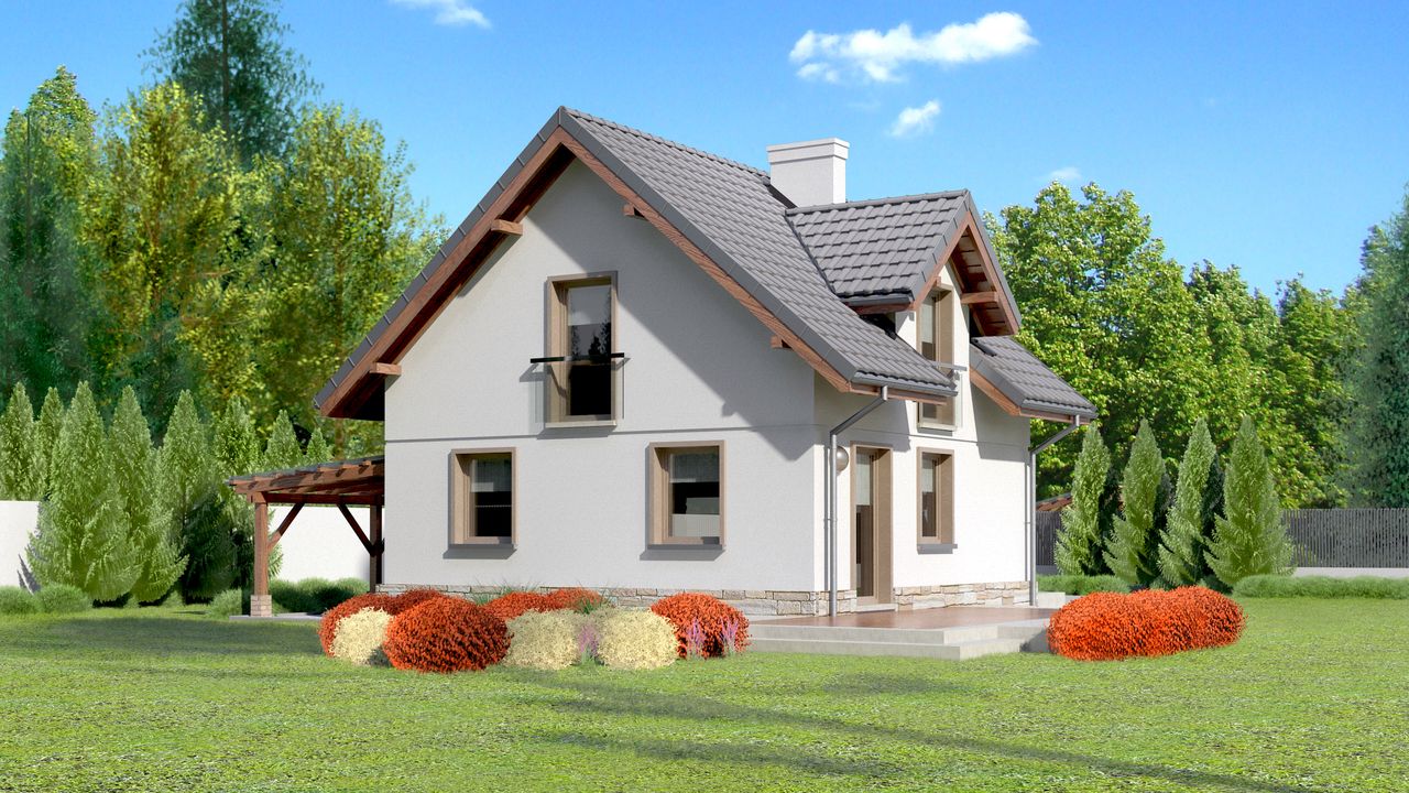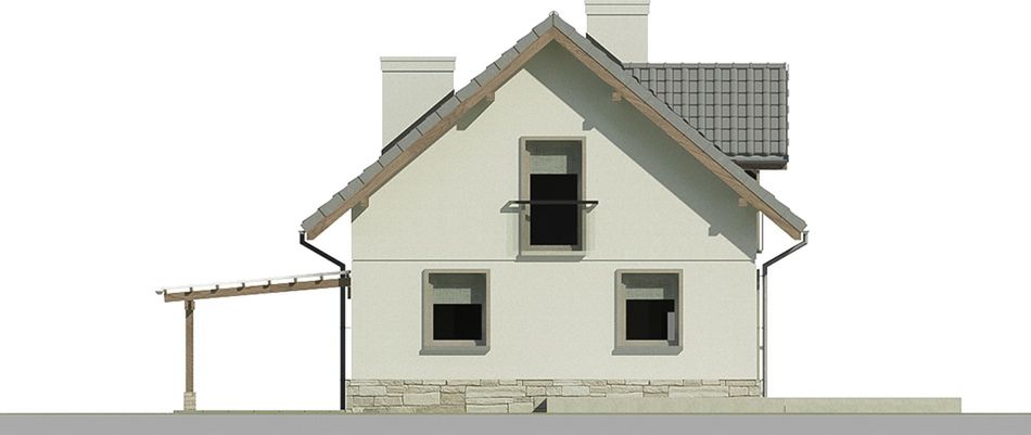 Graficzne opracowanie rzutów poglądowych widocznych na karcie projektu zostało wykonane przez Extradom.pl. Prezentowane przez Extradom.pl wizualizacje wykonane zostały przez autora projektu i należy poczytywać je jedynie za przykład i propozycję wykończenia, wizję architektoniczną autora projektu. Ostateczne wykończenie budynku może nastąpić na wiele sposobów. Szczegółowe rozwiązania zastosowane w oferowanej dokumentacji - w tym również ilość, lokalizacje i wygląd okien, drzwi, kominów - mogą w niewielkim stopniu różnić się od prezentowanej wizualizacji budynku.