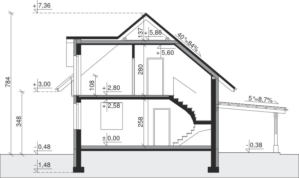 Ściany zewnętrzne: pustak 25 cm, styropian 15 cm. Ściany nośne: pustak 25 cm. Strop: monolityczny żelbetowy. Dach: kąt nachylenia 40°, pokrycie - dachówka ceramiczna lub betonowa.