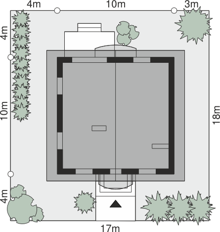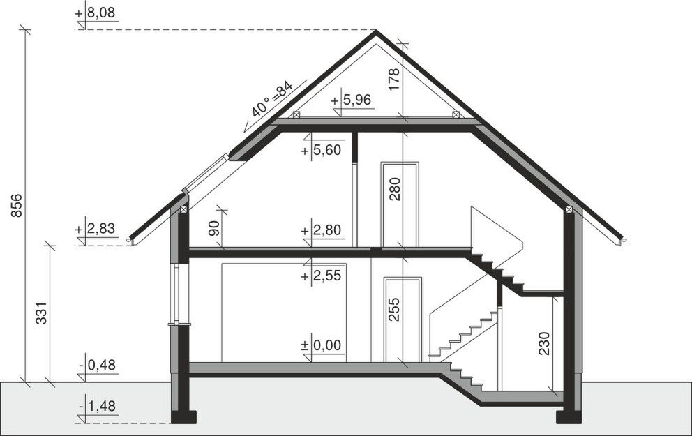 Ściany zewnętrzne: pustak 25 cm, styropian 20 cm. Ściany nośne: pustak 25 cm. Strop: monolityczny żelbetowy. Dach: kąt nachylenia 40°, pokrycie - dachówka ceramiczna lub betonowa. Instalacja solarna.