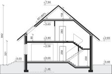 Ściany zewnętrzne: pustak 25 cm, styropian 20 cm. Ściany nośne: pustak 25 cm. Strop: monolityczny żelbetowy. Dach: kąt nachylenia 40°, pokrycie - dachówka ceramiczna lub betonowa.
