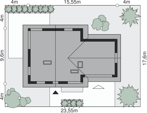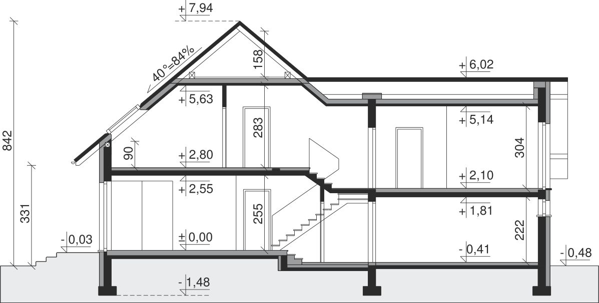 Ściany zewnętrzne: pustak 25 cm, styropian 20 cm. Ściany nośne: pustak 25 cm. Strop: monolityczny żelbetowy. Dach: kąt nachylenia 40°, pokrycie - blacha.