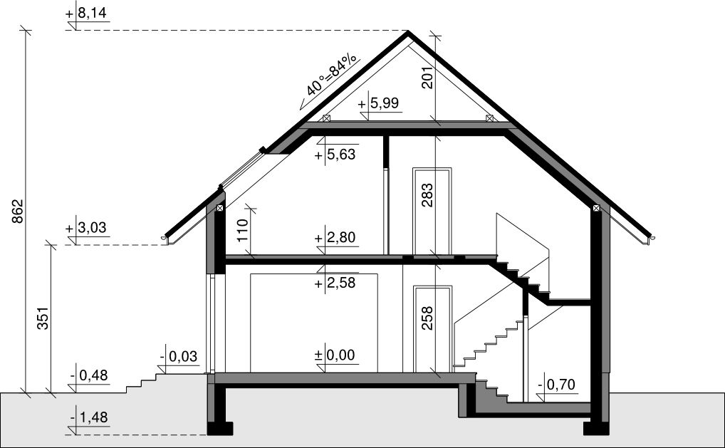 Ściany zewnętrzne: pustak 25 cm, styropian 20 cm. Ściany nośne: pustak 25 cm. Strop: monolityczny żelbetowy. Dach: kąt nachylenia 40°, pokrycie - dachówka ceramiczna lub betonowa. Instalacja solarna.