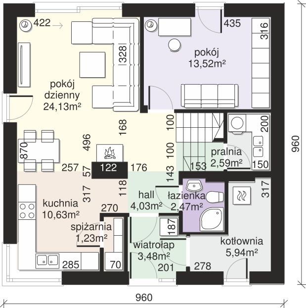 Po wejściu przez wiatrołap znajdujemy się w holu, który prowadzi do serca domu – otwartej strefy dziennej. Składa się na nią przestronny salon z miejscem na kominek oraz połączona z nim kuchnia, którą doświetla nowoczesne, narożne okno. Funkcjonalność kuchni podnosi bezpośrednio dostępna spiżarnia. Na parterze zlokalizowano również dodatkowy, ustawny pokój, który można zaaranżować jako gabinet, domową bibliotekę lub sypialnię dla gości. Uzupełnieniem programu tej kondygnacji jest łazienka, kotłownia oraz praktyczne pomieszczenie gospodarcze.