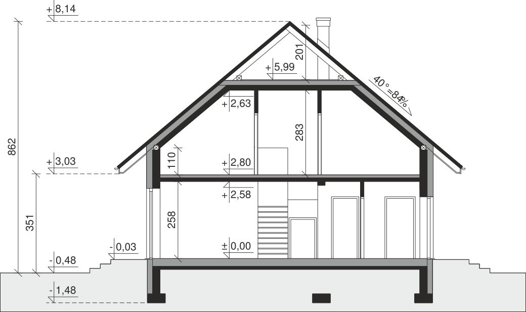 Ściany zewnętrzne: pustak 25 cm, styropian 20 cm. Ściany nośne: pustak 25 cm. Strop: monolityczny żelbetowy. Dach: kąt nachylenia 40°, pokrycie - dachówka ceramiczna lub betonowa. Instalacja solarna.