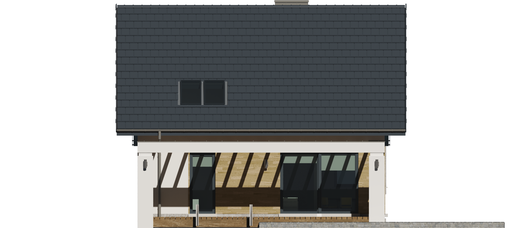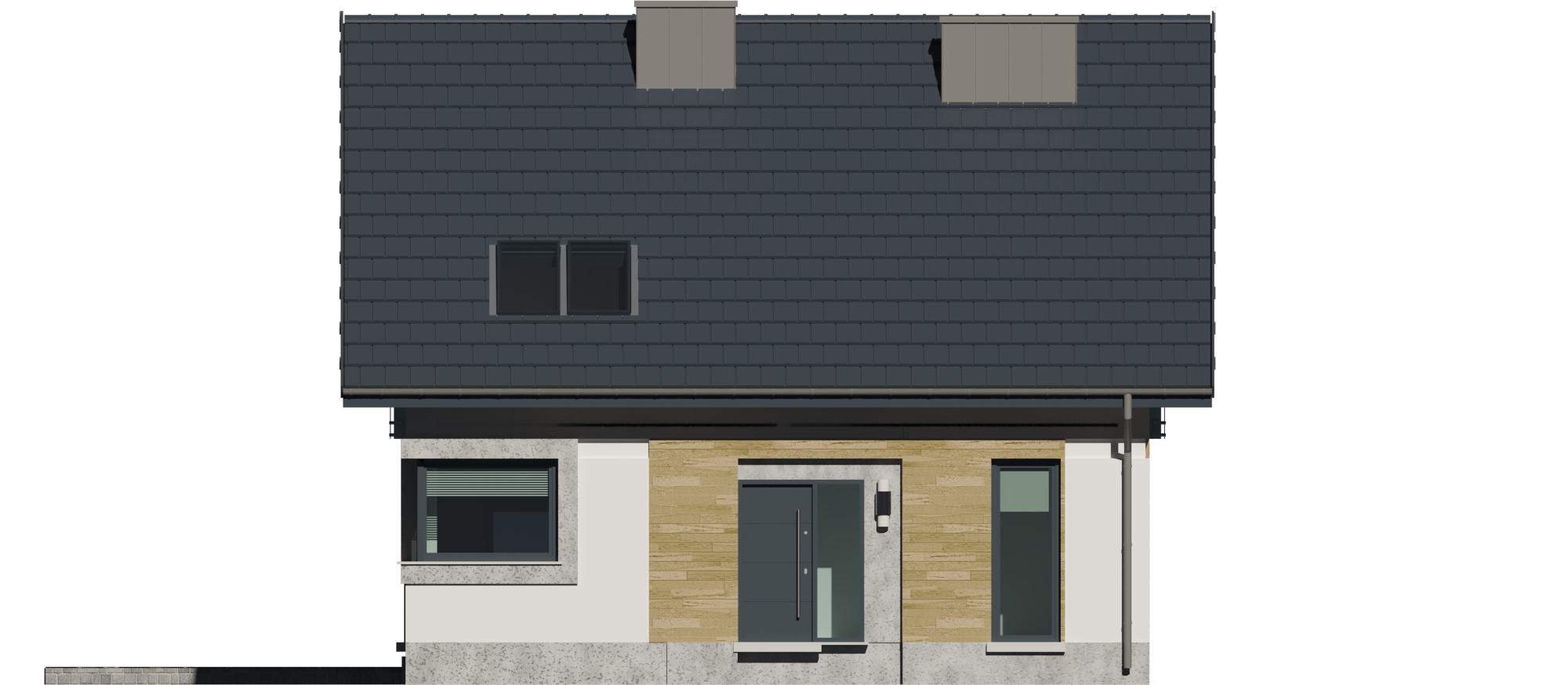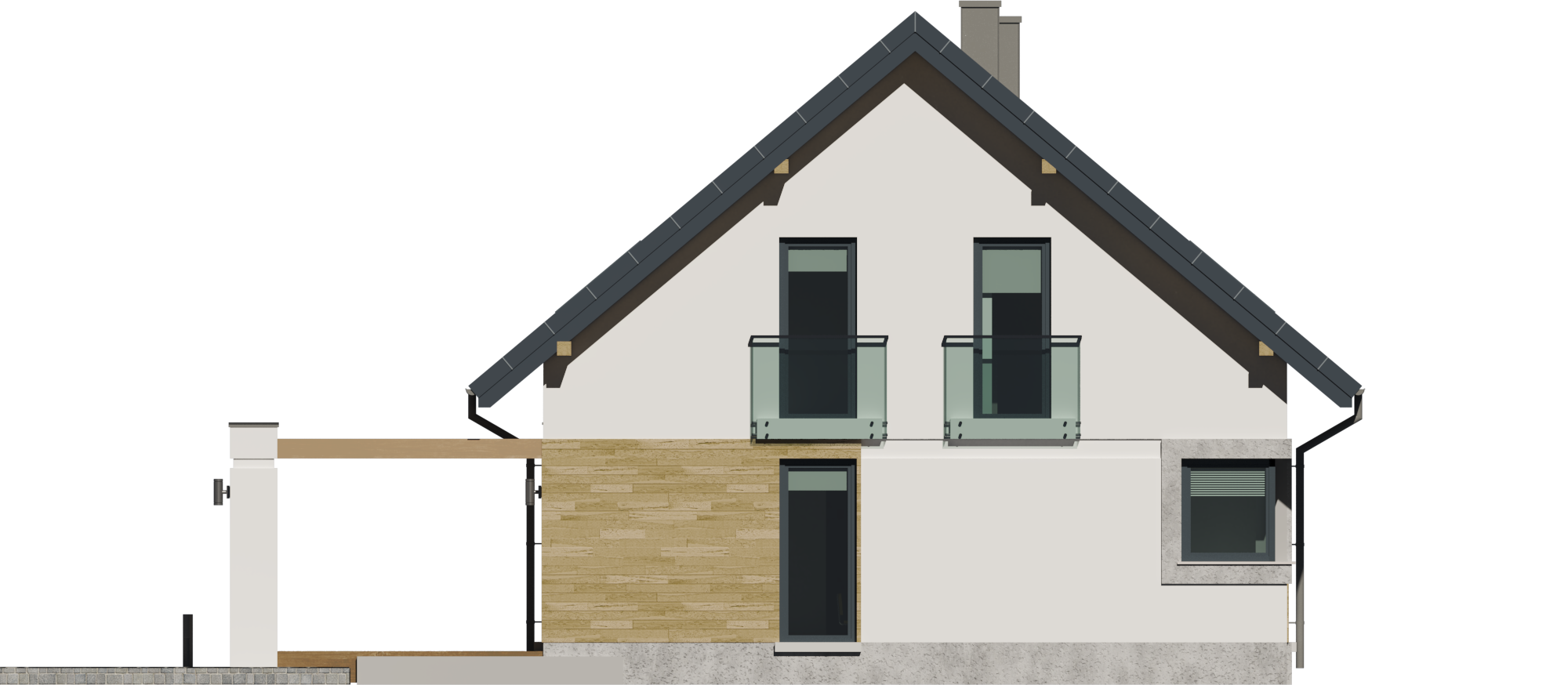 Projekt charakteryzuje się prostą, zwartą bryłą przykrytą klasycznym dwuspadowym dachem z okapem, co jest rozwiązaniem sprawdzonym i ekonomicznym w realizacji. Tradycyjny styl domu podkreślają starannie dobrane proporcje i detale. Duże przeszklenia, w tym efektowne narożne okno w kuchni oraz cztery okna dachowe, zapewniają doskonałe doświetlenie wnętrz na obu kondygnacjach.