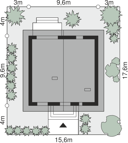 Ściany zewnętrzne: pustak 25 cm, styropian 20 cm. Ściany nośne: pustak 25 cm. Strop: monolityczny żelbetowy. Dach: kąt nachylenia 40°, pokrycie - dachówka ceramiczna lub betonowa. Instalacja solarna.