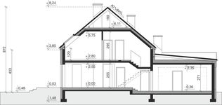 Ściany zewnętrzne: pustak 25 cm, styropian 20 cm. Ściany nośne: pustak 25 cm. Strop: monolityczny żelbetowy. Dach: kąt nachylenia 40°, pokrycie - dachówka ceramiczna lub betonowa. Instalacja solarna.