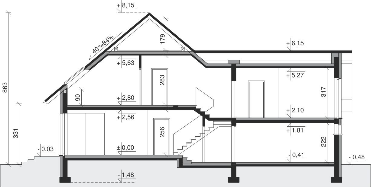 Ściany zewnętrzne: pustak 25 cm, styropian 20 cm. Ściany nośne: pustak 25 cm. Strop: monolityczny żelbetowy. Dach: kąt nachylenia 40°, pokrycie - blacha.