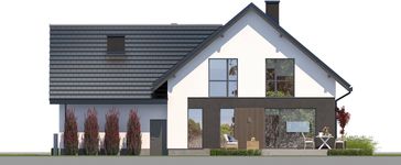 Graficzne opracowanie rzutów poglądowych widocznych na karcie projektu zostało wykonane przez Extradom.pl. Prezentowane przez Extradom.pl wizualizacje wykonane zostały przez autora projektu i należy poczytywać je jedynie za przykład i propozycję wykończenia, wizję architektoniczną autora projektu. Ostateczne wykończenie budynku może nastąpić na wiele sposobów. Szczegółowe rozwiązania zastosowane w oferowanej dokumentacji - w tym również ilość, lokalizacje i wygląd okien, drzwi, kominów - mogą w niewielkim stopniu różnić się od prezentowanej wizualizacji budynku.