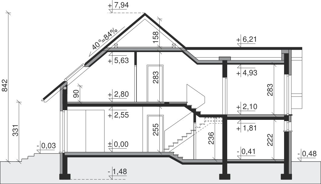 Ściany zewnętrzne: pustak 25 cm, styropian 20 cm. Ściany nośne: pustak 25 cm. Strop: monolityczny żelbetowy. Dach: kąt nachylenia 40°, pokrycie - dachówka ceramiczna lub betonowa.