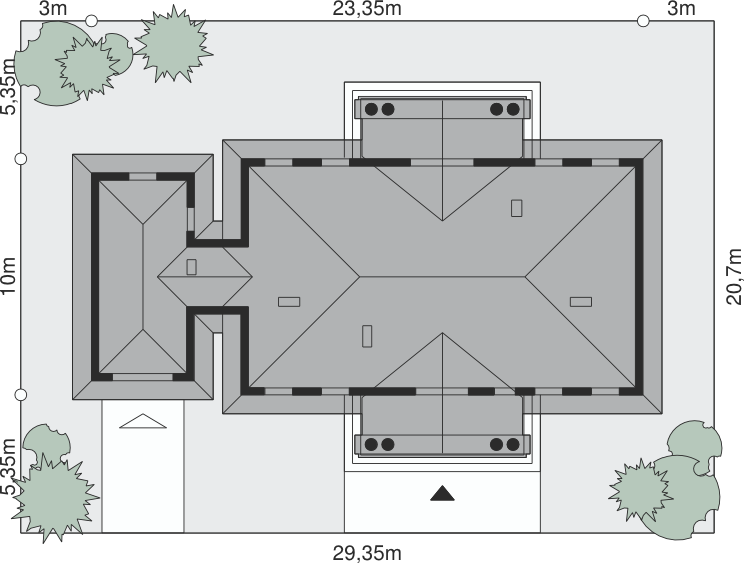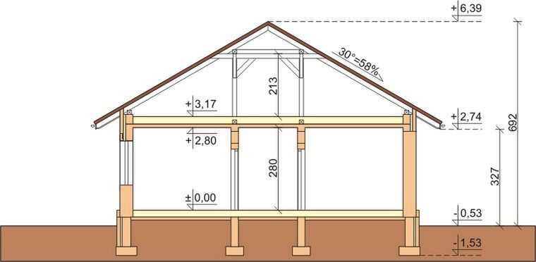 Ściany zewnętrzne: pustak 44 cm. Ściany nośne: pustak 25 cm. Strop: monolityczny żelbetowy. Dach: kąt nachylenia 30°, pokrycie - dachówka ceramiczna lub betonowa.