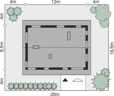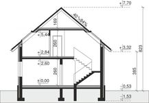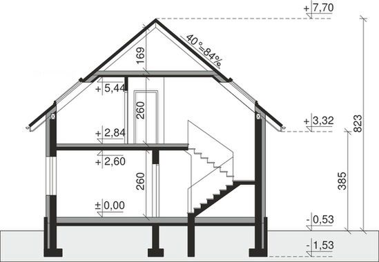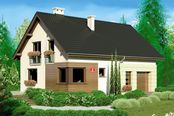 Ściany zewnętrzne: pustak 25 cm, styropian 15 cm. Ściany nośne: pustak 25 cm. Strop: monolityczny żelbetowy. Dach: kąt nachylenia 40°, pokrycie - dachówka ceramiczna lub betonowa.